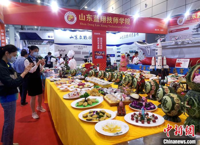 5月20日,中国各地职业院校赴济参展。图为蓝翔技师学校展示的烹饪菜品。 沙见龙 摄
