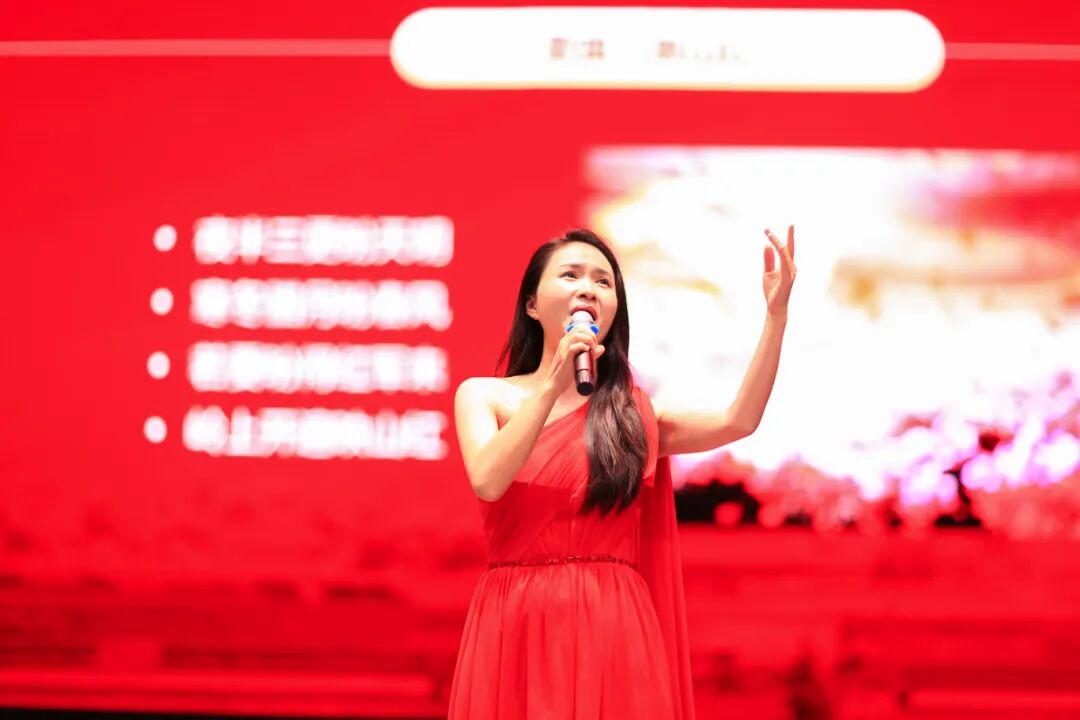 演唱嘉宾王韦韦以精湛的演唱技艺与饱满的情感表达,先后演绎《映山红》《唱支山歌给党听》《我的祖国》《春天的故事》等多首经典红色曲目。她清澈婉转的花腔唱腔与真挚动人的情感传递,将每首歌曲背后的党史故事娓娓道来,使师生在优美旋律中触摸历史脉动,在艺术熏陶中接受精神洗礼,实现了“听歌学党史、润物细无声”的育人效果。