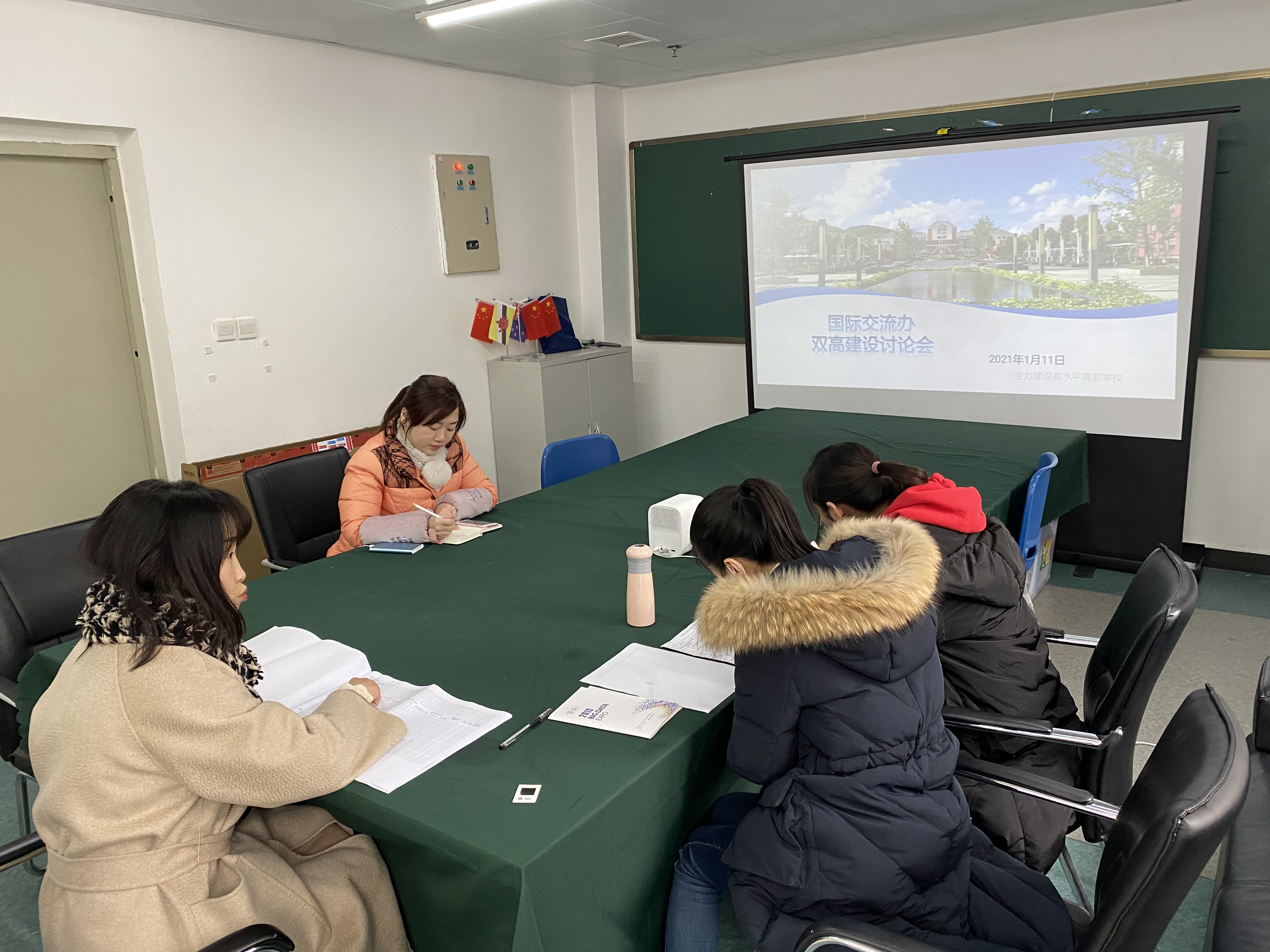 2021年1月11日,国际交流办公室举办了本年度第一次“双高”项目建设推进会。文佳主任主持会议,国际交流办公室全体教师参与了此次会议。