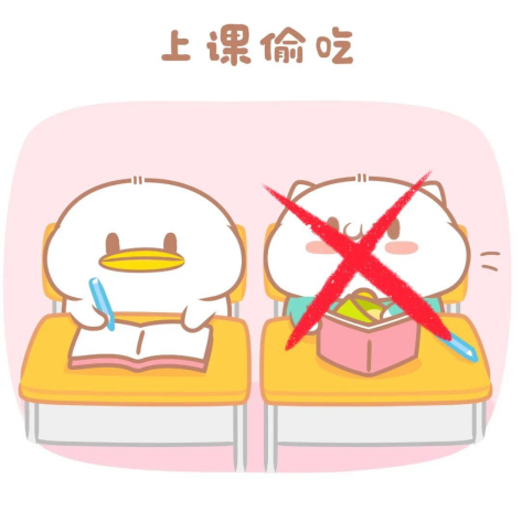1.拒绝教室 “零食味”,不携食品 “入座位”。不在上学途中购买早餐、零食、饮料(除瓶装纯净水外)等,避免将其带入教室,不因个人饮食需求破坏集体学习环境,共同保持教室空气清新。